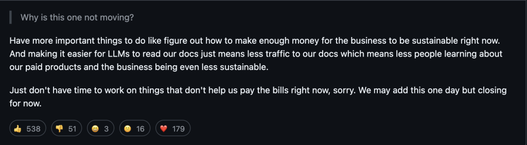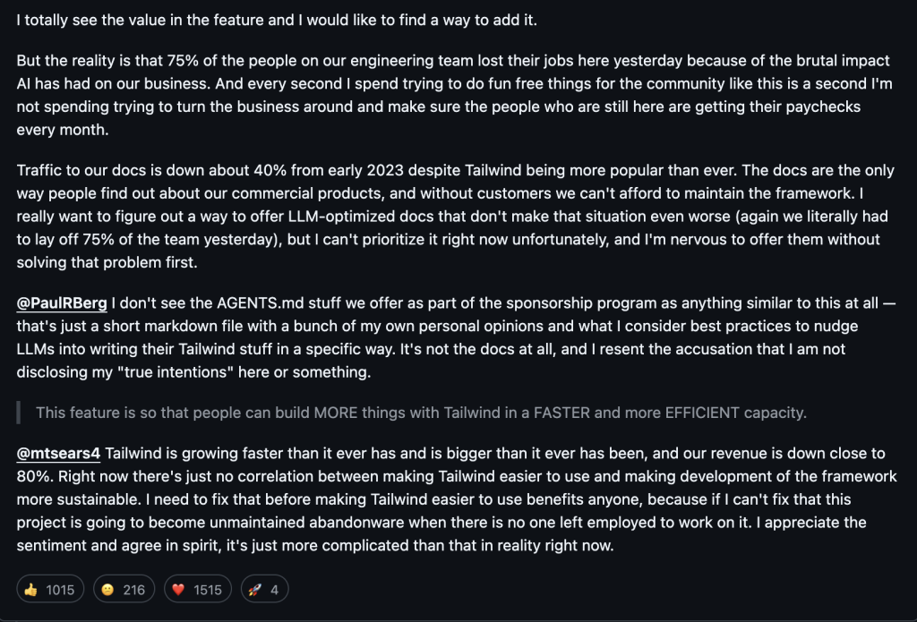 So here’s the PR request in context: someone asking Tailwind to make it even easier for AI to eat their lunch. The guy who submitted it seems genuine – he thinks it’s complementary, not competitive. He’s probably right in some abstract sense. He’s definitely wrong in the immediate, “we just fired three quarters of our team” sense.