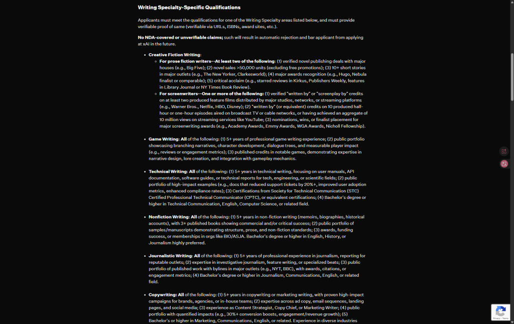 (in case that link doesn’t work, I’ve attached a screenshot: a job listing for a writer for Grok, with the minimum requirement of having released a novel under a major publisher or a won a book award or so forth)
