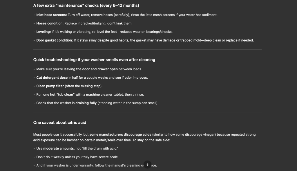 Run a cup of citric acid in a hot load in your washing machine once every two months or so. Do the same in a separate load with the sodium percarbonate. The citric acid cleans the built up residual detergent in your washing machine, the sodium percarbonate cleans the biological scum that builds up in your machine – mildew and other biofilms.