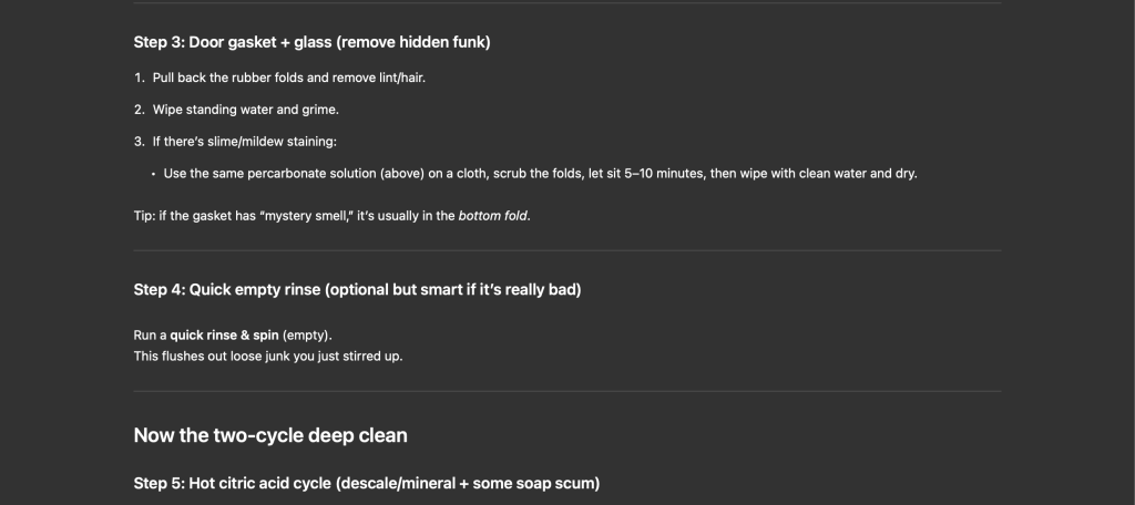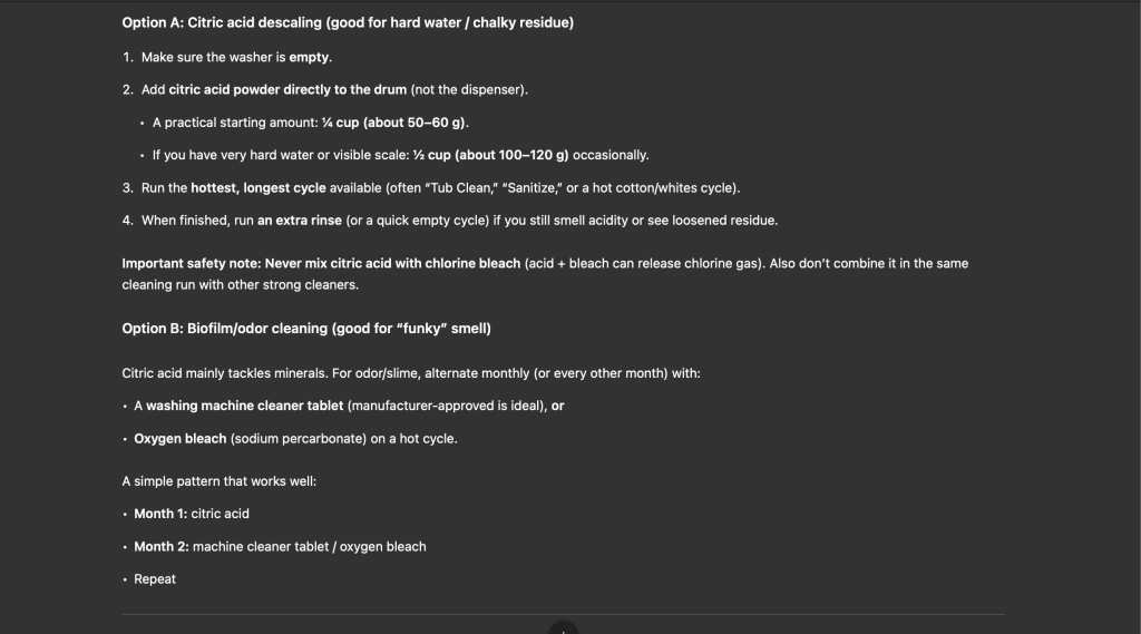 To clean Washing Machines: Buy Citric Acid and Sodium Percarbonate (or Oxiclean, depending on price – Oxiclean is half made up of Sodium Percarbonate anyway, so if it’s cheap enough you can substitute Oxiclean and just double the dose in your cleanings)